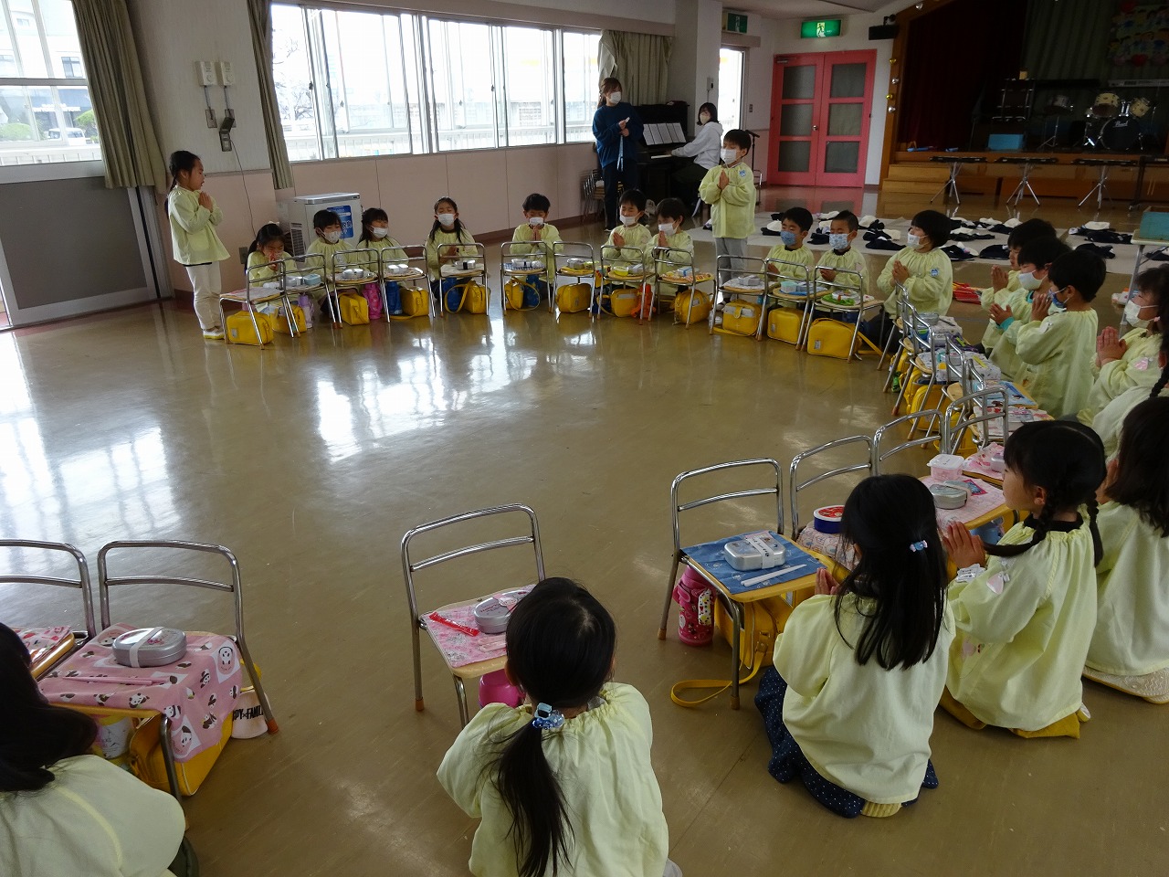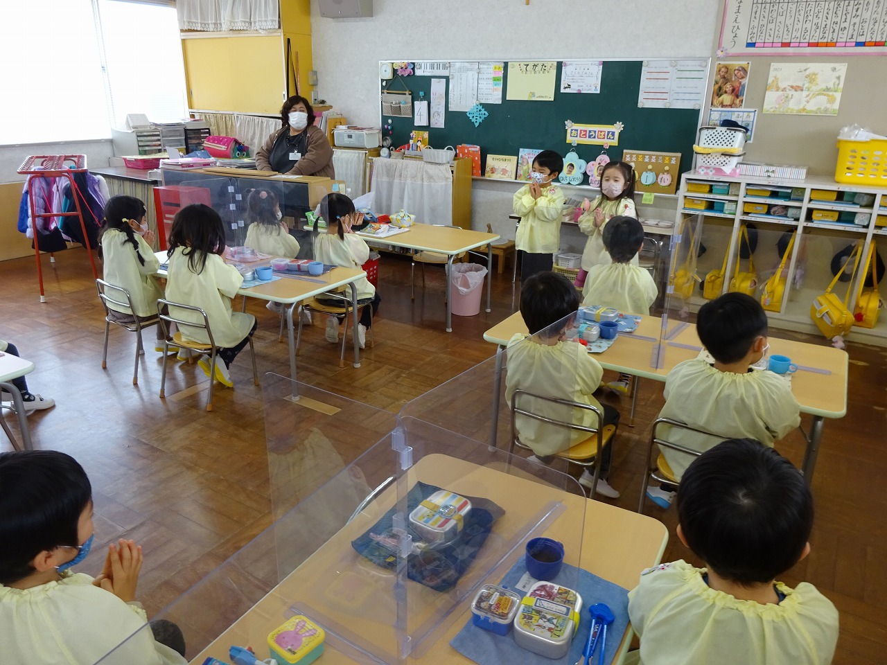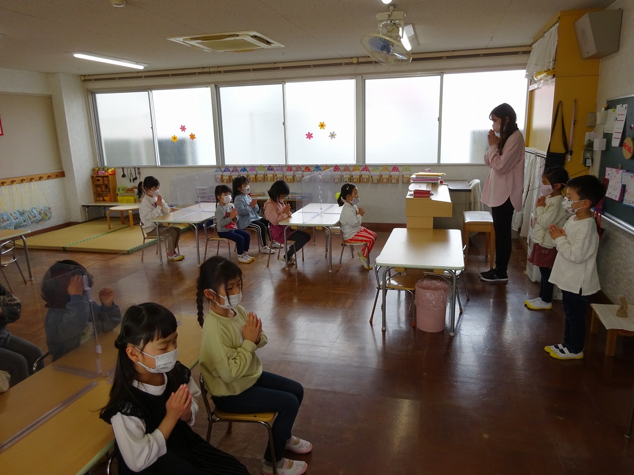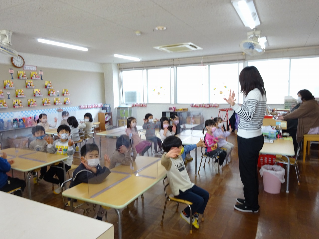 ![]() 先生のお話があります。 「きょうもいっしょにたのしく すごしましょう!」 |