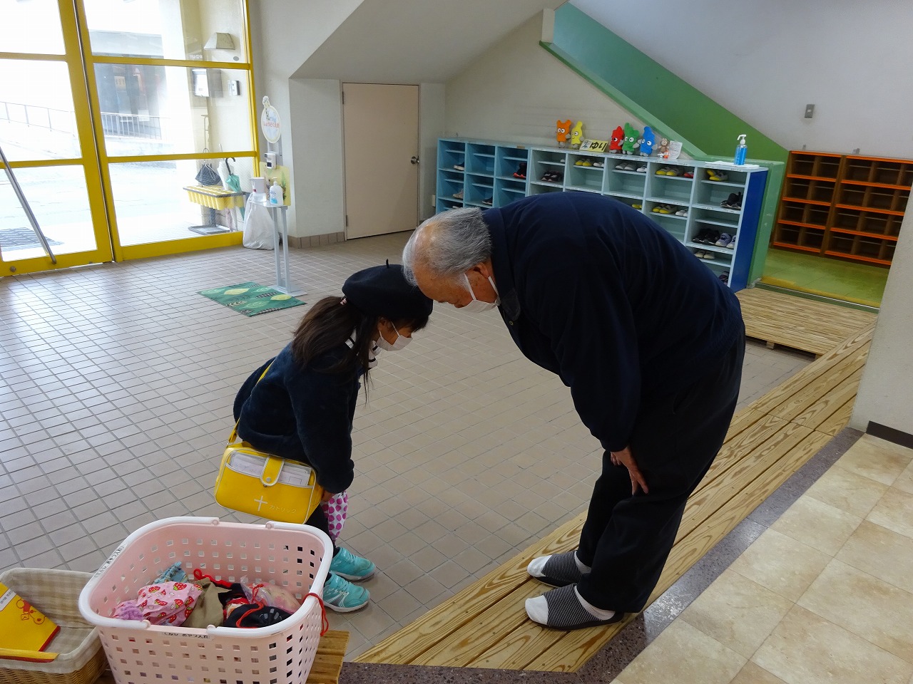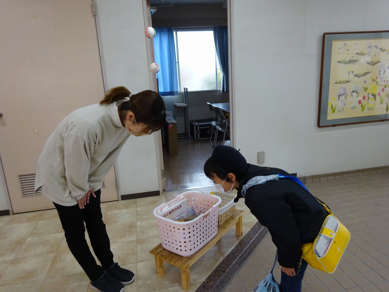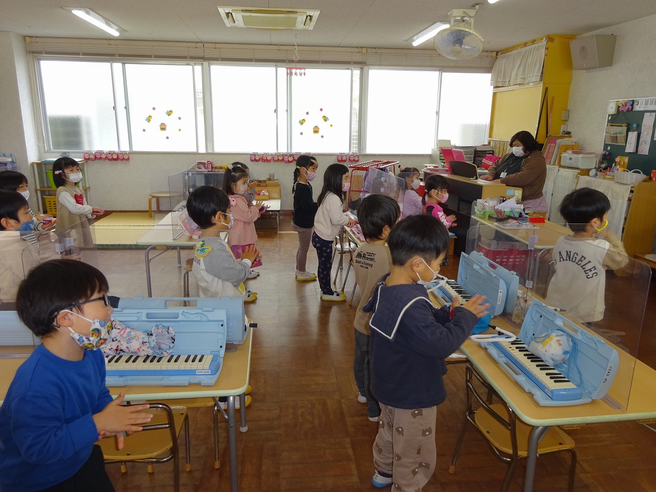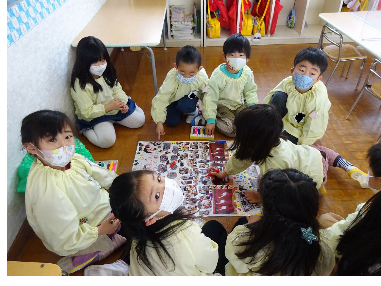 ![]() 先生のお話があります。 「きょうもいっしょにたのしく すごしましょう!」 |