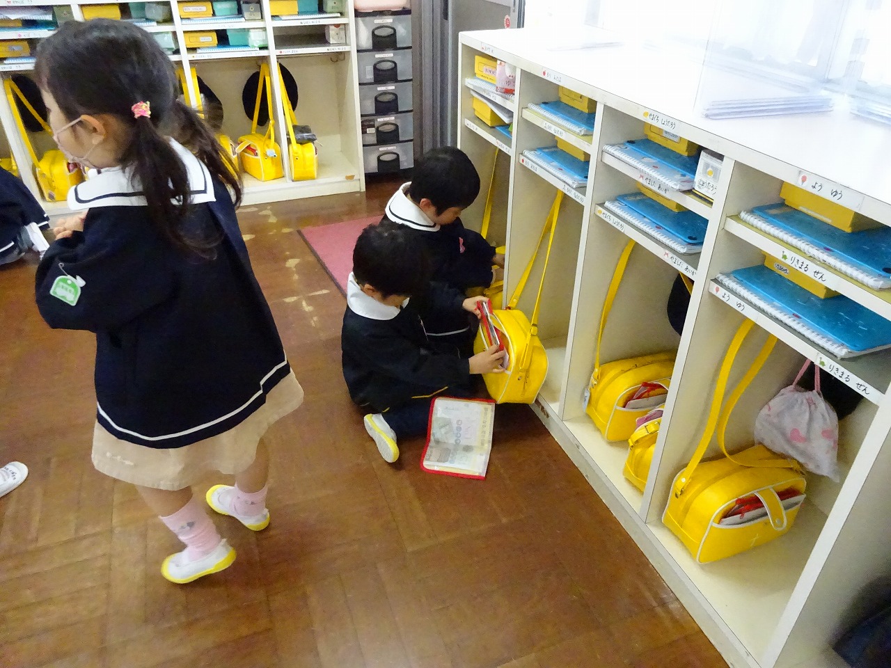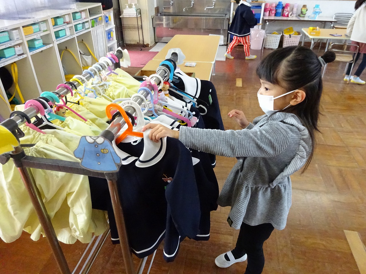 | 出席のシールを貼ったり、いろいろ・・・。 お着替えもします。 |
