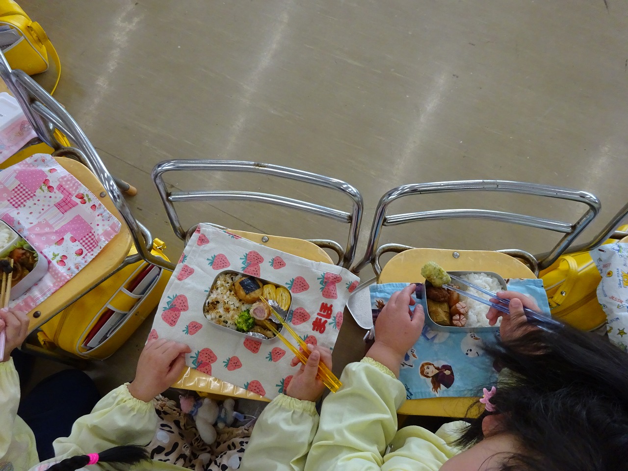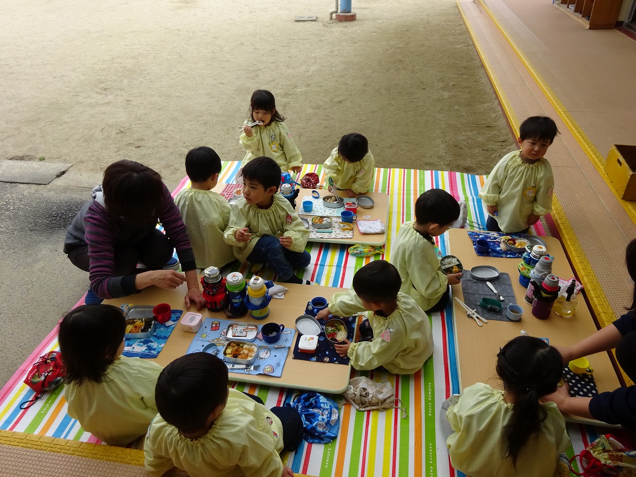 お外でピクニック気分でお弁当! 「おいしいね。」 「うん、おいしいね。」 |